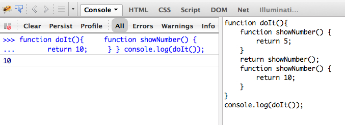 Just take a look at this code snippet on the right – I’ve been using Firebug,the Firefox add-on to run it. The code is on the right, and the result of invoking the function doIt() is on the left.