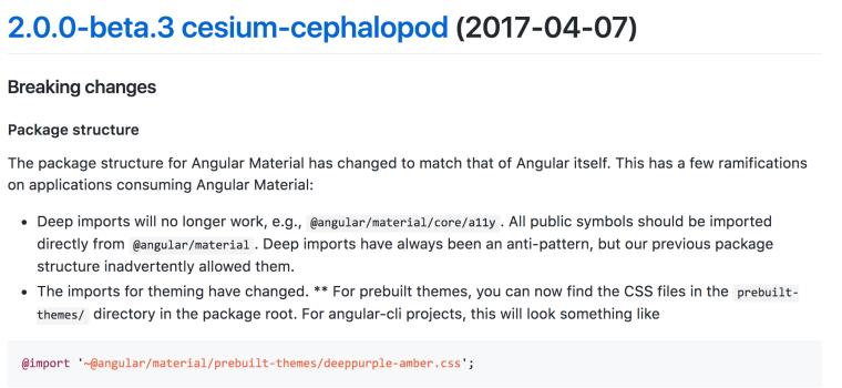 Hence, when Jim ran his Yarn install, he got Angular Material 2 2.0.0-beta.2, which had the file “node_modules/@angular/material/core/theming/prebuilt/indigo-pink.css”