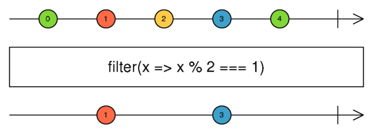 The filter() operator takes a function predicate as an argument, which returns true if the emitted value meets the criteria, or false otherwise. Only the values that meet the criteria will make it to the observer. This particular diagram uses the fat arrow function that checks if the current element is an odd number. The even numbers won’t make it further down the chain to the observer.