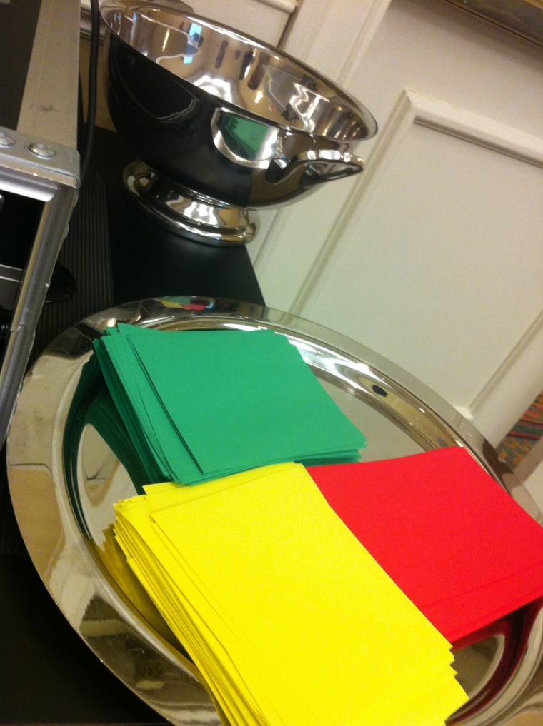 The KISS principle in action! Instead of forcing people to fill out these annoying questionnaires from traditional evaluation sheets, the attendees were asked to pick a sheet of the appropriate color and drop it in the bowl. Green, if you like the preso, yellow means the presentation deserved to be a part of the event, and red if it sucked. If you wanted to add some comments, pens were right there – just write whatever you want on this little piece of paper. Smart. Keep it simple stupid.