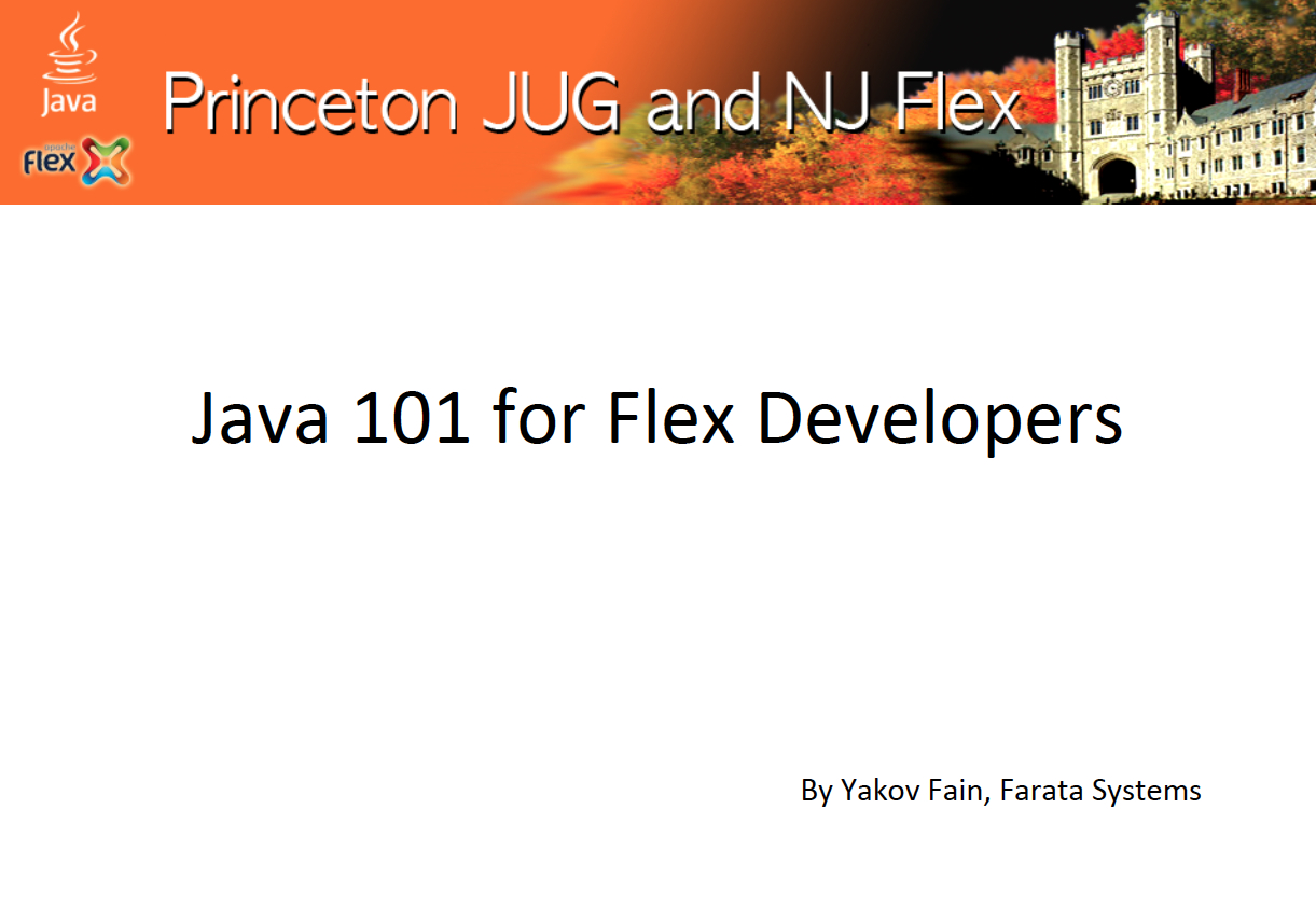 I’ve explained the Java basics comparing this language with ActionScript 3 everywhere I could. This presentation started with a quick HelloWorld in Eclipse, and then quickly progressed to abstract classes, generics, multi-threading and Java servlets. The more time a Flex developer spends with Java the better.