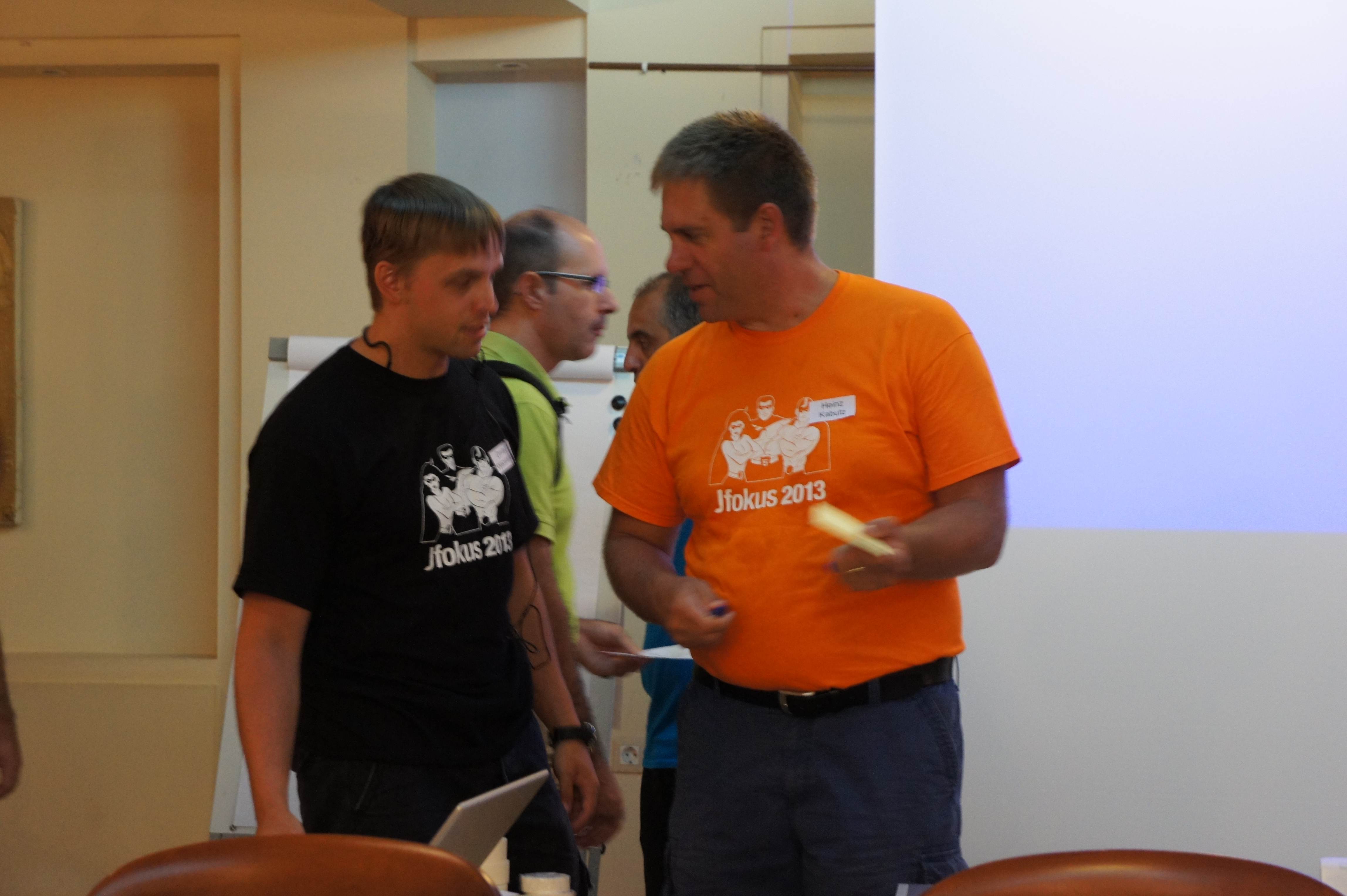 Then I’ve joined the session titled “Devops Tooling”. Devops are species that beside writing code are curious about how it’ll run in production. Typically devops are breeded in startups. Do you care if your programs log messages that can be useful for people from operations and customer support? If yes, you have a chance to join devops population. If you went as far as setting up monitoring tools so people from operation could be aware of the status of your app without the need to bother your highnessy – you have arrived to your destination. On the photo you see three Carl Quinn, Mattias Karlsson, and Kirk Peperdine participating in the devops discussion.