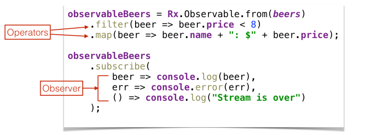 The following code sample declares an array of beers and turns it into Observable using the Observable.from() function. Then it applies the filter() operator to pass only the beers that cost less than eight dollars, and the chained map() operator converts the beer object into a string.