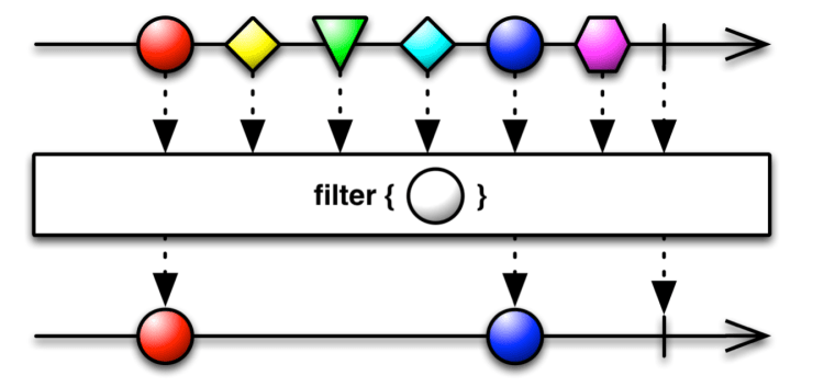Now let’s get familiar with the marble diagram of the filter() operator shown next.