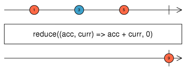 The reduce() operator emits the aggregated result when the observable completes. In the above example, it happened naturally, because we created an observable from an array with a finite number of elements. In other scenarios, you’d need to invoke the method complete() on the observer explicitly, and you’ll see how to do it in the next article of this series.